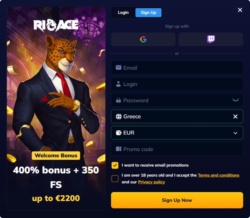 All offers are available for Greek players and can be accessed through the Promotions tab or by entering a valid Rioace promo code during deposit.